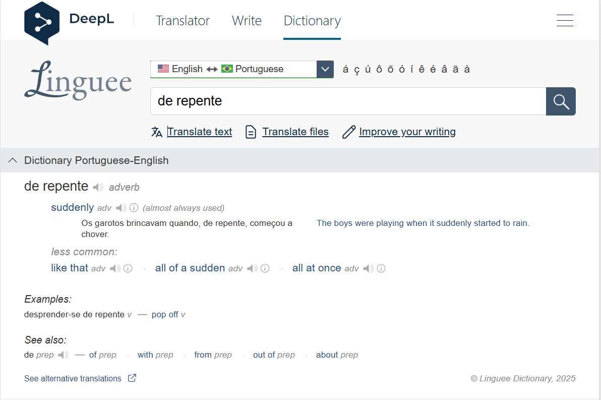 Head to the Portuguese-English Linguee Dictionary and type in the search box the “de repente”.