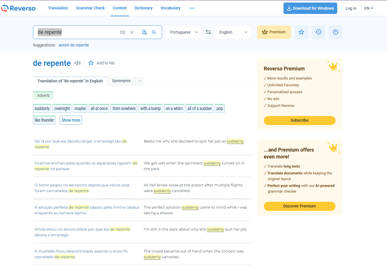 Head to Reverso Dictionary and type “de repente” in the search box.