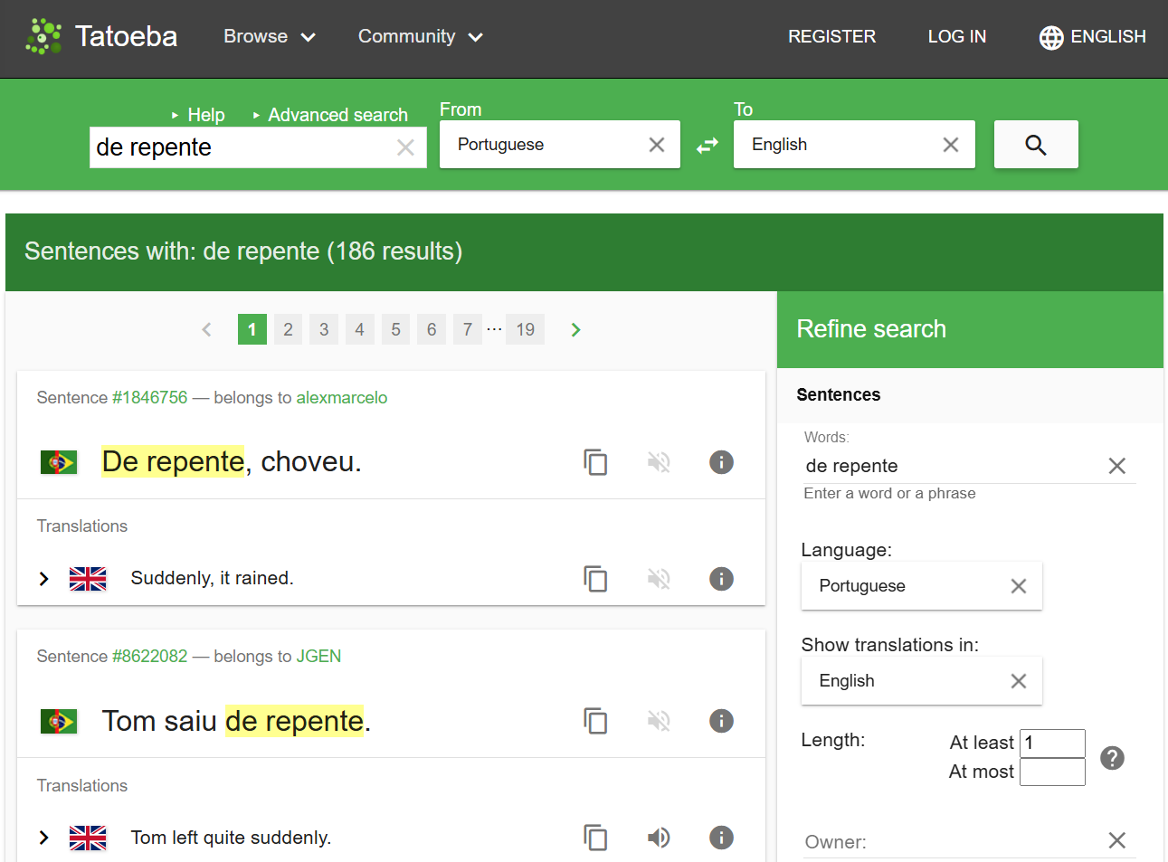 Head to Tatoeba and type “de repente” in the search box, hit Enter.